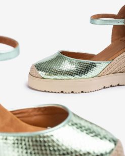 Alpargata con tira al tobillo d’orsay realizada en piel efecto metalizado. Cuña de rafia color natural de 7cm de altura y plataforma de 2cm. Suela de eva más ligera y flexible que nunca gracias a la tecnología superlight. esencia mediterránea en zapatos unisa.