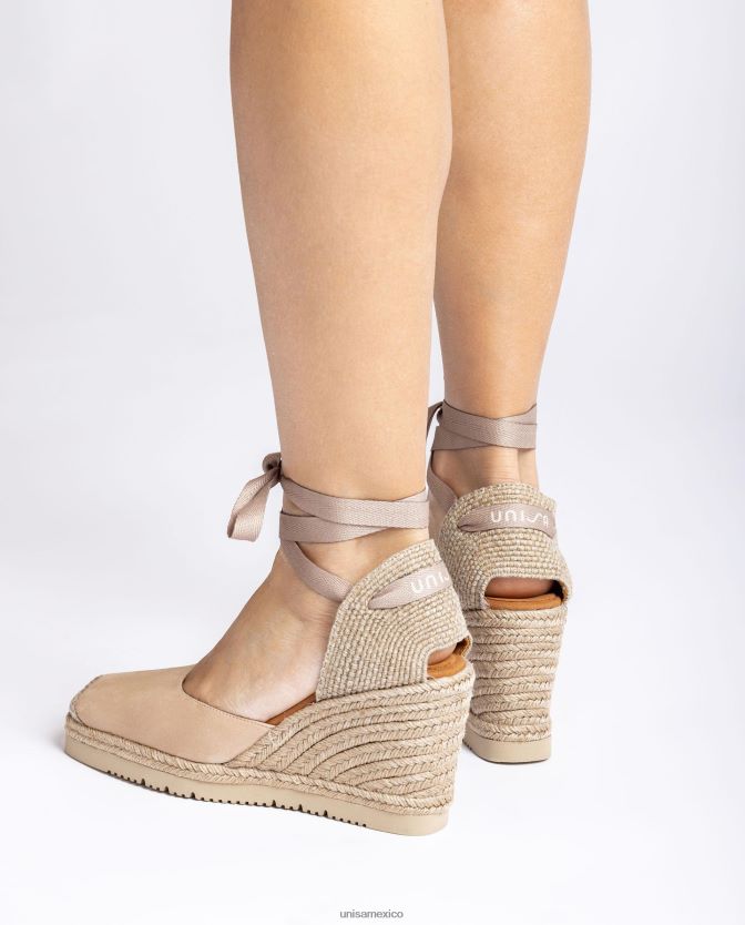 alpargatas en ante de cabritilla con cuña de yute y punta cuadrada. con plataforma de 2cm y cuña de 8,5cm de altura. tacón de tela con cinta a juego para anudar en el tobillo. Las alpargatas unisa se han convertido en un clásico.