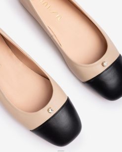 Zapatilla bailarina de punta cuadrada realizada en piel en contraste de color. puntera realizada en piel efecto metalizado y el resto del zapato en suave piel lisa. adorno de cristal cosido en la parte delantera. Suela de goma ligera, flexible y antideslizante. clásicos imprescindibles que se renuevan cada temporada.
