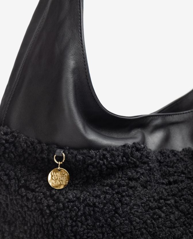 bolso tipo saco grande confeccionado en tejido de pelo. asa y pespuntes en piel. larga cadena de hombro de color dorado. esta bolsa será el centro de atención. 50 cm x 36 cm x 18 cm