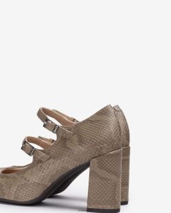 Salón de punta cuadrada realizado en piel grabada. Doble tira en el empeine con hebilla. Tacón ancho de 8,5 cm y suela de goma ligera, flexible y antideslizante. los aliados perfectos para la mujer unisa.