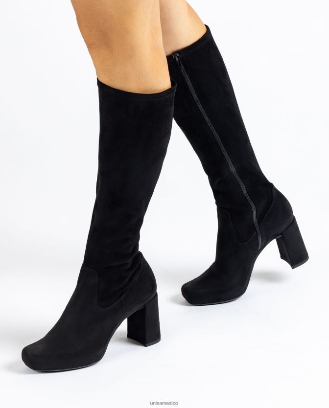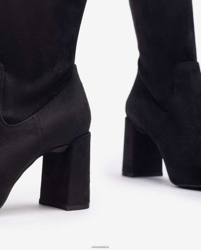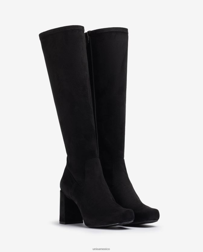 Bota de punta cuadrada confeccionada en tejido elástico efecto ante. Tacón de 8cm y plataforma interior de 1,7cm. Suela de goma ligera, flexible y antideslizante. ribete de costura en la parte delantera. un clásico imprescindible en el mundo unisa.