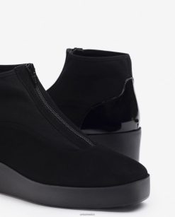 Botín de punta cuadrada elaborado en ante con tejido elástico en la parte superior y charol en la parte posterior del talón. cierre de cremallera en la parte delantera. suela superligera, tacón de 5cm y plataforma de 2,5cm. el concepto superlight está diseñado para que lleves las botas más cómodas del mercado.