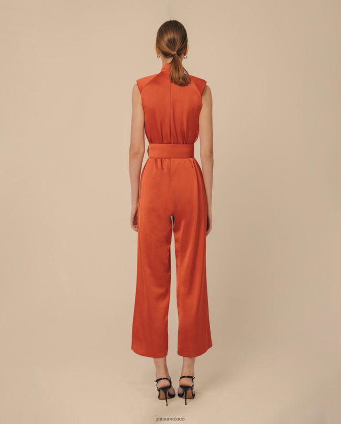 es un mono de corte recto con hombreras. Escote redondo ligeramente elevado con una pequeña abertura en la parte superior del escote. Pantalón de corte recto con cinturón del mismo tejido.