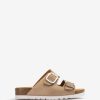 Sandalia realizada en piel con taco muy claro efecto madera. suela exterior de goma antideslizante y ribete troquelado en piel a juego.