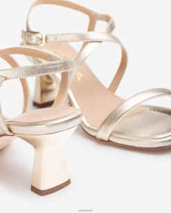 Sandalia de tiras de piel con acabado metalizado. correa de tobillo que se puede ajustar con la hebilla de metal. Tacón de 6,5 cm pintado a juego geométrico y suela color piel natural.