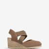 Sandalia de ante con elásticos cruzados y cuña forrada en yute natural. Tacón de 7,5 cm y plataforma de 2,5 cm. suela de goma ligera y flexible.