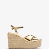 Sandalia de punta cuadrada realizada en charol arrugado. correas cruzadas en la parte delantera y una correa en el tobillo que se puede ajustar con la hebilla de metal. Cuña de 10cm y plataforma de 4cm recubierta de rafia natural. Suela de goma ligera y antideslizante. sandalias con diseños innovadores para todos tus eventos.