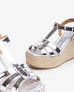 Sandalia de punta cuadrada confeccionada en tejido efecto espejo. tiras en la parte delantera y en el empeine y una tira en el tobillo que se puede ajustar mediante la hebilla metálica. Cuña de 10cm de altura y plataforma de 4cm recubierta de rafia natural. Suela de goma ligera y antideslizante. sandalias con diseños innovadores para todos tus eventos.