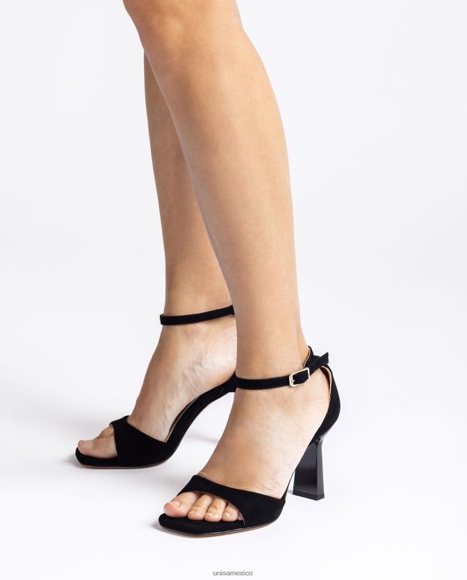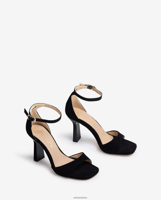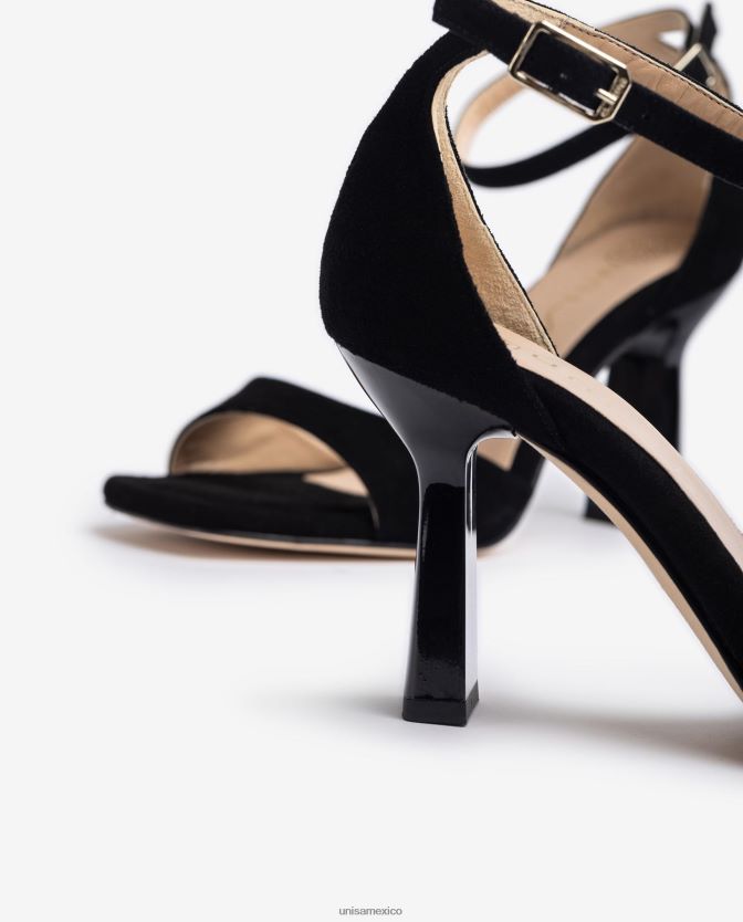 sandalias negras de ante niño. correa de hebilla ajustable en el tobillo. Tacón geométrico al tono de 8,5cm de altura. suela muy acolchada para tu comodidad, ¡te sorprenderá la comodidad de estas sandalias!