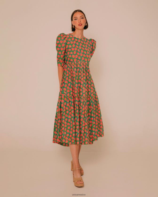 es un vestido midi con falda asimétrica. cuello redondo y manga francesa con volantes en los hombros. Cierre de cremallera invisible en la espalda.