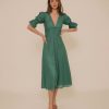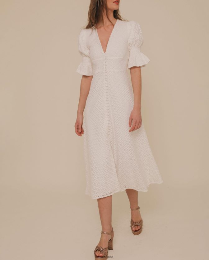 es un vestido midi de encaje matizado, con falda evasé. tiene un cuello en V con un juego de botones debajo. las mangas abullonadas tienen nido de abeja plisado.