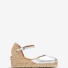 Alpargata con tira al tobillo y punta redonda d’orsay realizada en piel efecto metalizado. Tacón de rafia con tira ajustable con hebilla metálica. Cuña de 3,5cm de altura recubierta de yute color natural y plataforma de 1cm. Suela de eva más ligera y flexible que nunca gracias a la tecnología superlight. la esencia del mediterraneo en zapatos unisa.