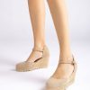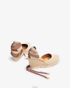 Alpargata de punta redonda con cuña de yute. Plataforma de 1cm y cuña de 7,5cm de altura. Pala de tejido ecolino fabricada 100% con botellas de plástico recicladas y tacón de rafia con cinta a juego para anudar al tobillo. Suela de eva más ligera y flexible que nunca gracias a la tecnología superlight. unisa ama el planeta!