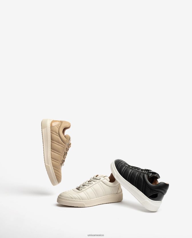 Zapato deportivo realizado en piel efecto capitoné y charol en la parte trasera del talón. suela ligera, flexible y antideslizante y plantilla ergonómica y extraíble que reduce la fatiga provocada por la marcha. Forro interior de respilon. un concepto urbano y sofisticado que encaja a la perfección con la filosofía unisa.