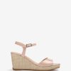 Sandalia de piel con tacón de cuña. correa de tobillo que se puede ajustar con la hebilla de metal. Tacón cuña de 8 cm y plataforma de 2,2 cm recubierta de rafia. suela de goma antideslizante, ligera y flexible.