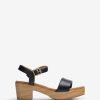 Sandalia de piel con efecto bloque de madera. correa de tobillo que se puede ajustar con la hebilla de metal. Pala de piel con perforaciones decorativas en forma de cadena. Suela efecto madera con tacón de 5,5 cm y plataforma de 3 cm.