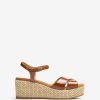 Sandalia de punta cuadrada realizada en charol arrugado. correas cruzadas en la parte delantera y una correa en el tobillo que se puede ajustar con la hebilla de metal. Cuña de 5cm de altura recubierta de rafia natural de crochet y plataforma de 3cm. Suela de goma ligera y antideslizante. comodidad llevada a su máximo esplendor.