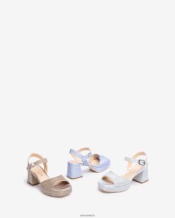 Sandalia de punta cuadrada realizada en tejido brillante. Tirantes anchos en la parte delantera y una correa en el tobillo que se puede ajustar con la hebilla de metal. Tacón de 7cm y plataforma de 2,5cm a juego. Suela de goma ligera y antideslizante. formas sencillas y limpias que hacen de cada modelo una pieza única.