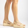Sandalia de punta cuadrada realizada en ante. tiras en la parte delantera y en el empeine y una tira en el tobillo que se puede ajustar mediante la hebilla metálica. Cuña de 10cm de altura y plataforma de 4cm recubierta de rafia natural. Suela de goma ligera y antideslizante. sandalias con diseños innovadores para todos tus eventos.