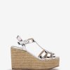 Sandalia de punta cuadrada realizada en piel efecto metalizado. tiras en la parte delantera y en el empeine y una tira en el tobillo que se puede ajustar mediante la hebilla metálica. Cuña de 10cm de altura y plataforma de 4cm recubierta de rafia natural. Suela de goma ligera y antideslizante. sandalias con diseños innovadores para todos tus eventos.