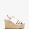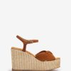 Sandalia de punta cuadrada confeccionada en tejido efecto espejo. tiras en la parte delantera y en el empeine y una tira en el tobillo que se puede ajustar mediante la hebilla metálica. Cuña de 10cm de altura y plataforma de 4cm recubierta de rafia natural. Suela de goma ligera y antideslizante. sandalias con diseños innovadores para todos tus eventos.