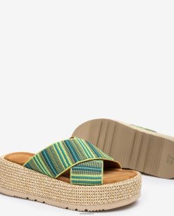 sandalia de punta redonda con tiras cruzadas multicolor. Tacón ancho de 4,5 cm de altura y plataforma de 3 cm, revestido en rafia de color natural. Espuma gruesa en toda la suela para mayor comodidad. comodidad llevada a su máximo esplendor.