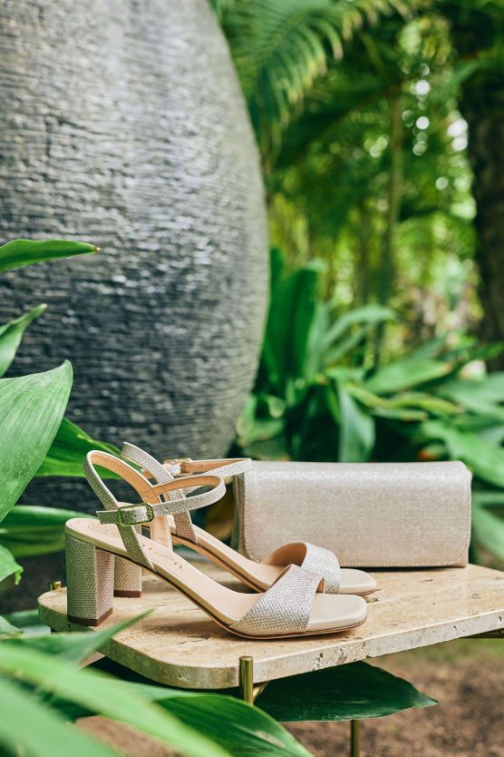 sandalias en tejido efecto brillo. Hebilla metálica ajustable en el talón. suela cuadrada forrada en piel a tono y tacón ancho de 6cm de altura. suela de cuero antideslizante. unas sandalias de tacón sensato, pensadas para tu día a día.