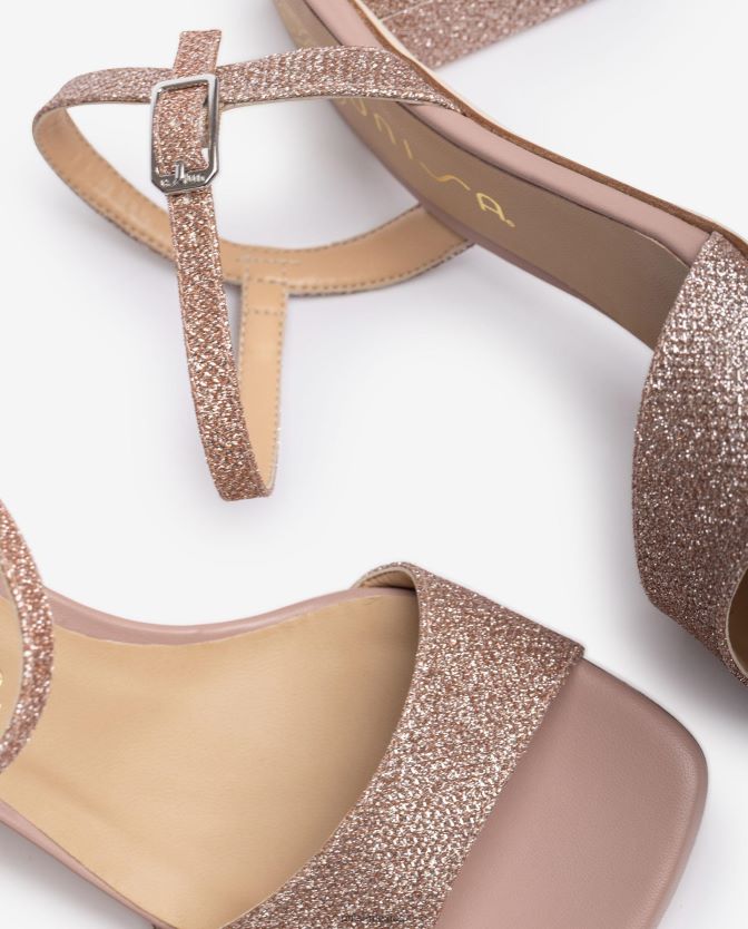 sandalias en tejido efecto brillo. Hebilla metálica ajustable en el talón. suela cuadrada forrada en piel a tono y tacón ancho de 6cm de altura. suela de cuero antideslizante. unas sandalias de tacón sensato, pensadas para tu día a día.