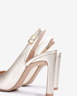 Zapato destalonado de punta redonda elaborado en piel acabado metalizado. Tacón de 10cm forrado en ante y plataforma interior de 1,5cm. Suela de goma ligera, flexible y antideslizante. una correa de tobillo dorada que se puede ajustar con la hebilla de metal. tus aliados perfectos para todos tus eventos!